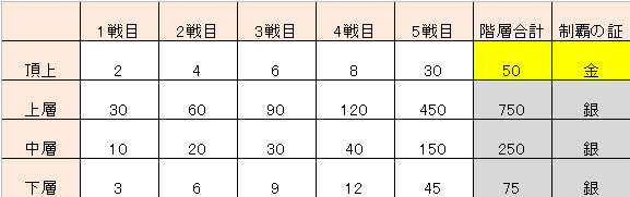 もらえる証の種類と個数は階層・戦目ごとに決まっており、