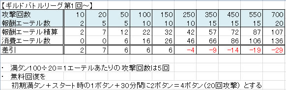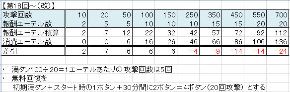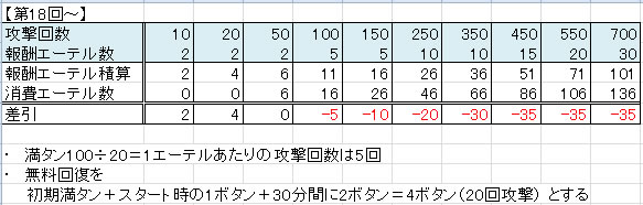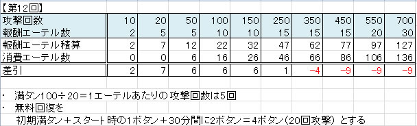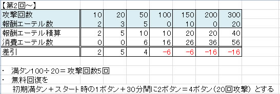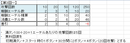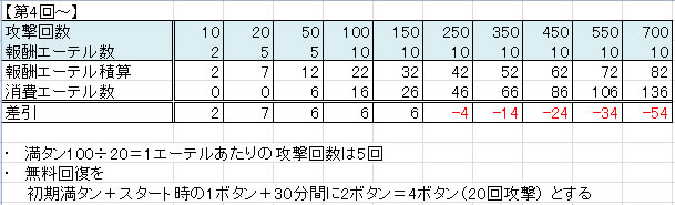 アタック回数報酬と必要エーテル表